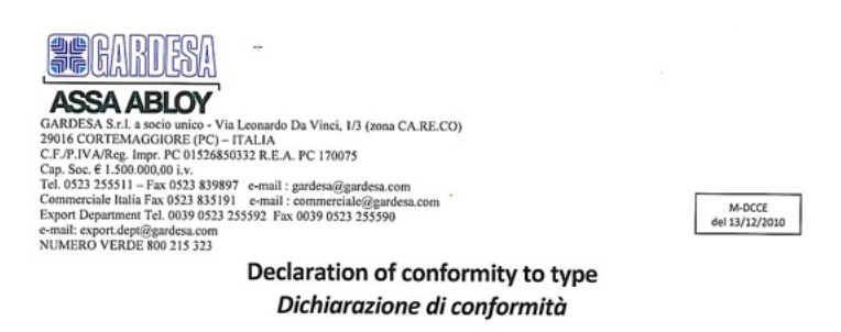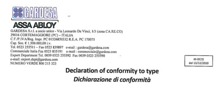 Declaration-of-conformity_Gardesa_Futura Garanzia-2014 Gardesa_Sentinel